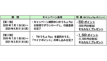 第2弾キャンペーンでは、7月1日から申し込みがスタートするマイナポイント事業で、指定するキャッシュレス決済サービス(還元先)にゆうちょPayを選ぶと1500ポイントをもれなくプレゼントする。