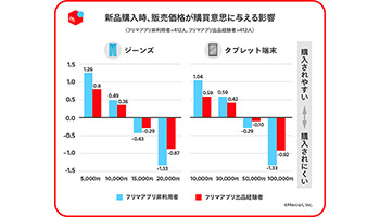 さらに、フリマアプリ出品経験者は、フリマアプリでの売却比率が10%上昇すると、新品に支払える上限金額も上昇。支払える上限金額は、新品ジーンズで約2000円、タブレット端末で約2400円上昇していた。