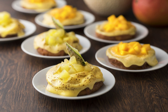 バニラ風味のサバイヨンソースをかけたフレンチトーストを焼きあげ、フレッシュフルーツをトッピング。見た目も華やかな一品です。