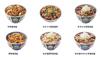吉野家は、7月15日20時まで「超特盛祭」を実施している。牛丼、スタミナ丼、牛カルビ丼、豚丼、ねぎ塩豚丼、ねぎ塩牛カルビ丼の全6種の超特盛サイズが10%オフになる。