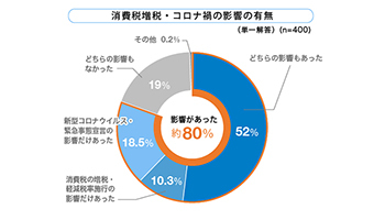 調査対象者に、決算業務を行うにあたって「消費税の増税・軽減税率施行」や「新型コロナウイルス・緊急事態宣言」の影響の有無について尋ねたところ、80.8%が「影響がある」(どちらかのみを含む)と回答した。