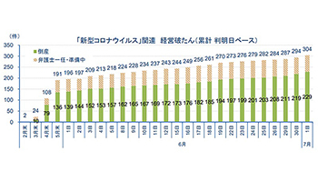 新型コロナウイルス感染症に関連した破たんは、2月25日の第1号発生以来、4月27日に100件目、6月3日に200件目となっており、6月にこれまでを上回るペースで月間103件発生し、7月1日に10件が発生したことで累計300件を超えている。