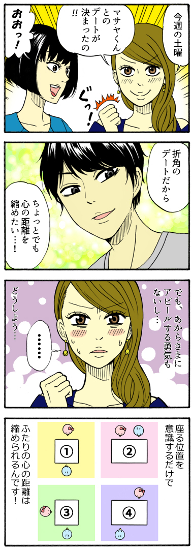 この座り方は物理的距離が一番近いので、心理的距離も近くに感じる効果があります。