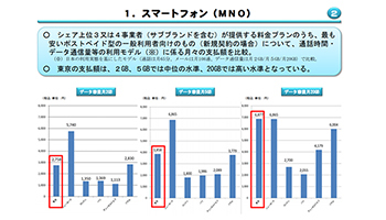 スマホのMNOの場合、上位3社のうち最も安いポストペイド型の一般コンシューマ向け(新規契約)月額料金で、1カ月のデータ容量2GBは東京で2758円となり、ニューヨーク(5740円)とソウル(2830円)に次ぐ3位だった。月のデータ容量5GBは東京で3858円となり、やはりニューヨーク、ソウルに次ぐ3位でいずれも中位となった。