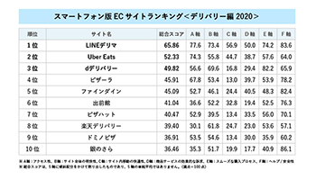 同ランキングでは、デリバリーサービスを行うピザーラ、ピザハット、ドミノピザ、出前館、銀のさら、ファインダイン、Uber Eats、LINEデリマ、楽天デリバリー、dデリバリーの、10社の公式スマートフォンECサイトを対象に、6月上旬から中旬にかけてユーザビリティ(使い勝手や安全性など)を評価している。