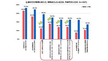 夏のマスク着用にあたっての、現時点での工夫と今後の工夫を比較すると、「夏用のマスクを買った/作った」が33.2%増加したほか、「タブレット・ガム・キャンディ」などによる対策を考えている人も大きく増加していることが明らかになった。