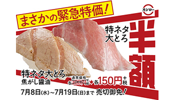 あきんどスシローは、本日(7月8日)から7月19日まで、「特ネタ大とろ」(税別300円)をいつもの半額(税別150円)で提供する。お持ち帰り「特ネタ大とろセット(6貫)」も税別1800円のところ、税別900円になる。