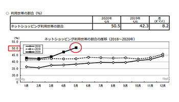 総務省によると「実店舗の休業で買い物ができなかった商品や、昨年まではネットで購入していなかった商品などもネットで購入したことで、ネットショッピングの利用率が伸びた。5割以上は過去最高の数字」と分析する。