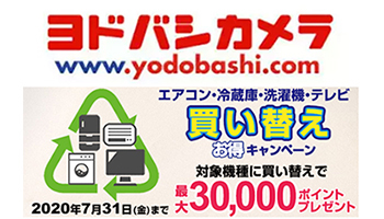 ヨドバシカメラは7月1日から31日まで、エアコン、冷蔵庫、洗濯機、テレビの買い替えキャンペーンを実施中だ。期間中に対象の商品を購入して、8月23日までに配送、リサイクル回収、設置工事(エアコンの場合)が完了する商品に対して、通常ポイントの還元に、さらに最大3万ポイントを上乗せする。