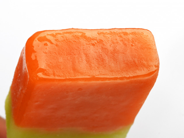 そういう意味では現在発売されている『まるで完熟メロン』の完成度は非常に高い。ねっとりとしたオレンジ色の完熟赤肉メロン部と、緑色の皮をイメージしたシャキシャキの食感のアイス部で、それぞれ味と食感を変え、風味はもちろん香りも強く、なんといっても見た目も楽しいです。