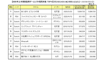 KADOKAWAのゲーム総合情報メディア「ファミ通」は、2020年上半期の国内家庭用ゲームソフトとハードの売上速報を、7月9日に発表した。集計期間は、2019年12月30日~6月28日。