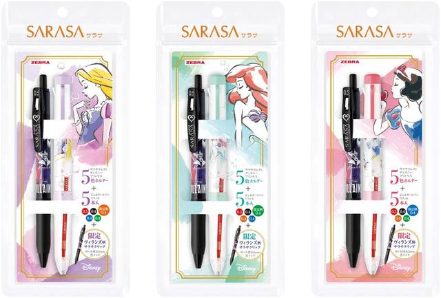 ボディや替え芯(リフィル)を自由に組み合わせられる多機能ペン「サラサセレクト」と、ジェルボールペン売上No.1の「サラサクリップ」に、手描き風のディズニープリンセスのイラストが入った、これまでになく大人なデザインが魅力です。