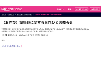 楽天モバイルは7月17日、ウェブサイトの「サポート」ページにいったん掲載したシステムメンテナンス情報を削除し、代わりに「誤掲載に関するお詫びとお知らせ」を掲載した。 これまで不定期に実施されていた、楽天モバイルのアプリのシステムメンテナンスではなく、音声通話、データ通信、SMSといった基本サービスのシステムメンテナンスの予告を見たユーザーがSNS上で「対象地域が広すぎる、時間が長い(8時~21時、終了次第再開)」などと不安視する声が出ていたところ、誤掲載だったと分かった。