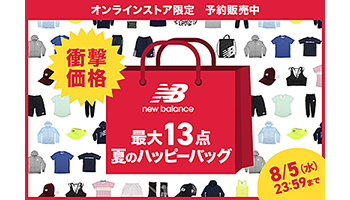 アルペンは、健康的な身体作りを応援するため、ニューバランスとタッグを組んでトレーニングウェアや小物類など、最大13点をセットにした夏の福袋「夏のハッピーバッグ」の先行予約を数量限定で7月17日に公式オンラインストアで開始した。税別価格は、メンズおよびレディスが8000円、ジュニアが5000円。
