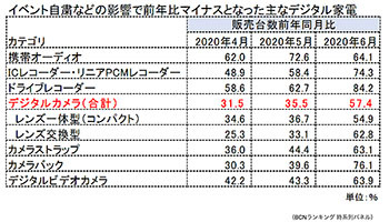 家電量販店・オンラインショップの実売データを集計した「BCNランキング」によると、デジタル家電の販売は特需に沸くカテゴリと、急落するカテゴリに二極化が顕著であり、カメラ本体とカメラ関連のアクセサリは後者に分類される。もし、Go Toキャンペーンが、当初の発表通りの規模で7月22日からスタートしていたら、もしかすると、中には「観光時にはやはりいいカメラが欲しい」とニーズがあり、今年後半から販売台数が急回復する可能性があったかもしれない。