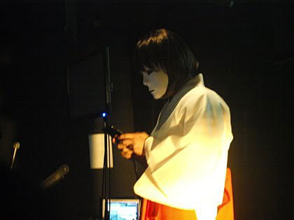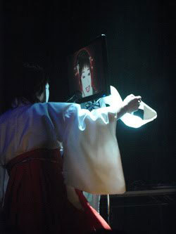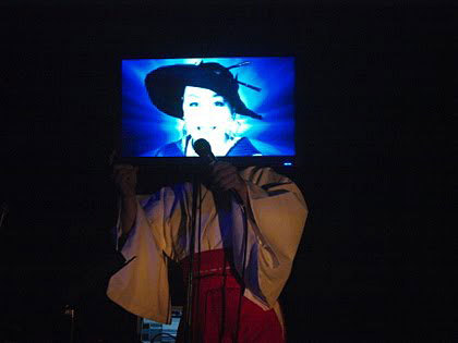 さらに面白いのは、ディスプレイを二つ持ち込んで、そのディスプレイに映った民謡歌手にマイクを向けると歌が流れ出す、というようなシカケ!いや、声が流れ出すところでマイクを向けてるだけってのはわかってるんですが…でも、なんだか面白いアイディアじゃないですか?見せ方にとことんこだわるOmodakaさんなのです。そしてこの歌手の方、有名な金沢明子さんらしい?!