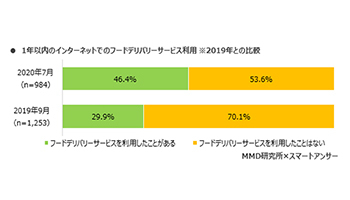 フードデリバリーサービスを知っていると回答した人に、フードデリバリーサービスを利用したことがあるかを尋ねた質問では、46.4%が利用経験があり、2019年の同様の調査と比較して16.5ポイント増えている。