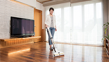 ローラーの回転が自走力につながるため、それほど力を入れなくてもヘッド部がスイスイと前に進む。スティック型掃除機を使っているのと同じ感覚で、立ったまま雑巾がけができるため、腰に負担なく疲れないのが魅力的だ。スティックを左右に倒すとヘッドの小回りが利くため、ソファーの下なども掃除できる。
