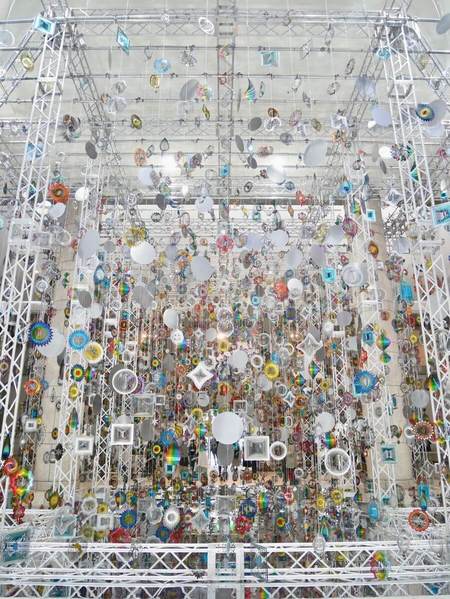 横浜美術館会場を入ってすぐに目の前に現れるのは、アメリカ出身のニック・ケイヴによる巨大なインスタレーション《回転する森》。