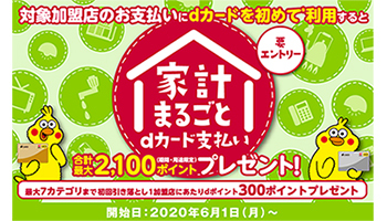 NTTドコモのクレジットカード「dカード」は6月1日から、エントリーの上、対象の公共料金などを初めて支払うと、1カテゴリにつき300ポイントプレゼントする「家計まるごとdカードのお支払いがおトク!」を実施している。同様の口座引き落とし変更キャンペーンは珍しくはないが、対象企業ともらえるポイント数が多いので、dカード(dカード・dカード GOLD)保有者は要チェックだ。