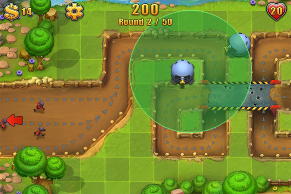 ですので、道の横に攻撃ユニットを配置するようになります。画面右下に配置できるユニットと、配置にかかるコストが表示されていますので、好きなユニットを指でなぞってフィールドに配置していきます。ユニットを配置する際に周りに表示される薄緑の円は、そのユニットが攻撃可能な範囲を示しています。一度置いたユニットはその場から動かず、攻撃範囲に入った敵を自動で攻撃し続けます。