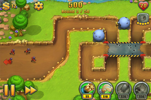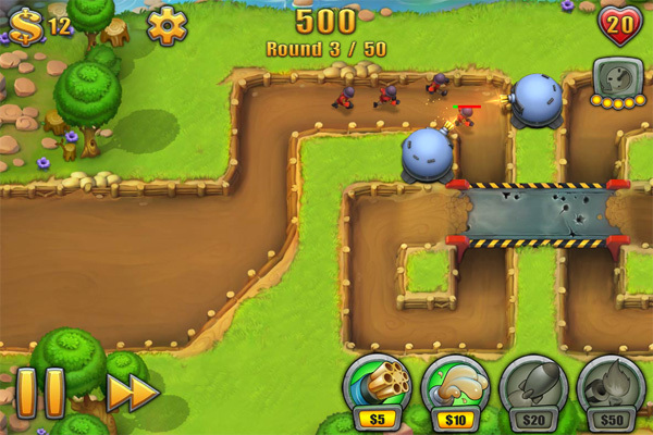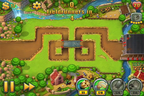 具体的にゲームの流れを紹介しましょう。草原のようなフィールドに道が敷かれています。このフィールドの右にプレイヤーが守るべき自陣があり、左から敵がやってきます。ならば道をふさいじゃえばいいじゃんと思われるかもしれませんが、残念ながらこのフィールドの場合、道に自分の攻撃ユニットを配置することはできません。
