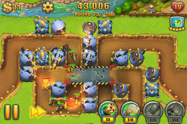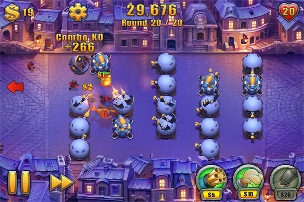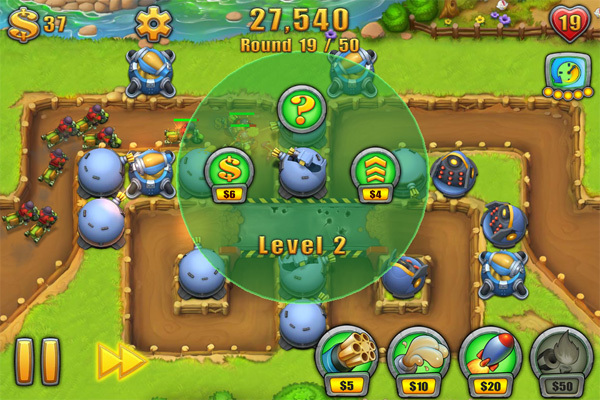 一度置いた攻撃ユニットにはもう触れる必要はありませんが、敵を倒すことでたまる資金を使ってレベルアップすることもできます。配置済みのユニットをタップすると薄緑の円が表示されますので、右の上向きの矢印アイコンをさらにタップ。すると、ユニットがパワーアップします。資金を使って新たなユニットを配置するか、それとも配置済みのユニットをレベルアップさせるかはそのときの状況次第。プレイヤーの戦略が問われるところですね。