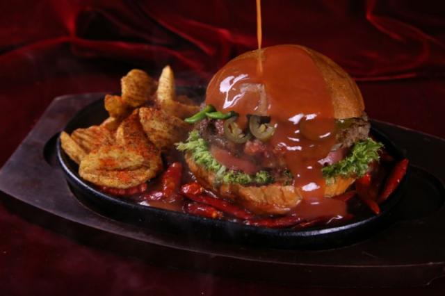本ハンバーガーは、目が痛くなる程辛い匂いを漂わせた激辛ハンバーガーを鉄板の上に乗せ、仕上げに目の前で激辛ソースをかけて完成となる一品です。