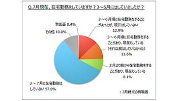 調査に回答した有職者のうち、3~6月の期間に在宅勤務を経験は3割弱で、「正社員」で4割に達した。「パート・アルバイト」では、8割弱の人が同期間に在宅勤務を経験していない。