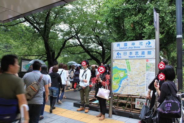 全国20カ所の21公演のチケットすべてが1分以内に瞬殺されたというツアーのファイナルだけあって、九段下駅から武道館に向かう道はファンでいっぱい。仕事帰りのOL風の方から、いわゆるバンギャル(V系ファンの女性の総称)ファッションに身を包んだ女性やコスプレ、ギャル男や黒いスウェットのオラオラ系の男性まで客層はいろいろ。さすがに髪を盛り盛りにしたage嬢は見かけませんでしたが(ライブの場合、頭が大きいと後ろの人がステージ見れなくなりますからね)、ギャル系の方もチラホラ。浴衣姿のファンの方も見かけました。