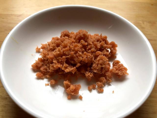 こちらも160gの大容量で、お値段はまさかの150円以下! 製造は国内にある業務スーパーの関連工場です。鶏肉とにんじん、ごぼう、しょうがの野菜がそぼろ状になっており、砂糖醤油ベースの味がついています。