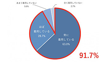 マスク着用に関する意識調査では、外出時にマスクを着用している人は91.7%に達した。また、マスクの着用によって、例年の夏より暑さを感じる人は88.4%を占めた。