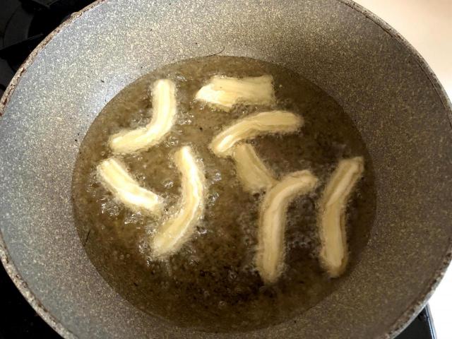 油で揚げるときは、1本1本がくっつかないようにたっぷりの油で少ない本数を揚げるのがコツです。欲張ってたくさん上げてしまうとあっという間にくっつき、チュロスの形じゃなくなるので要注意!