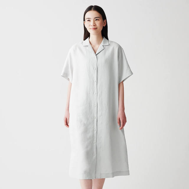 フレンチリネン洗いざらし五分袖開襟ワンピース・シルバーグレー