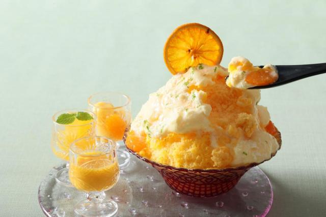 「愛媛県“みきゃん”のご褒美かき氷」はマンゴーのフワフワ氷に、みかんとヨーグルトのエスプーマソースをかけ、その上にドライミカン・ライムの皮を削った一品。