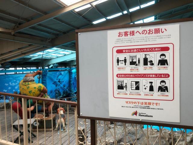 館内各所にアルコール消毒を設置し、ソーシャルディスタンスの表示もあるスパリゾートハワイアンズ。
