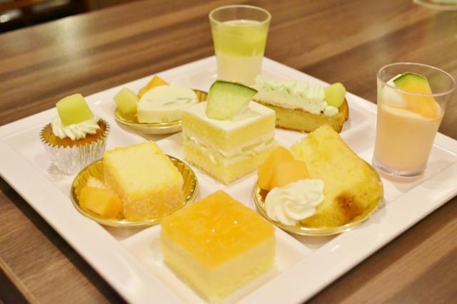シェフパティシエのおすすめプレートには、「メロンジュレムース」、「メロンモンブラン」、「赤肉メロンのブランマンジェ」「メロンヨーグルトムース」、「メロンショートケーキ」、「赤肉メロンのヨーグルトシフォンケーキ」、「メロンの杏仁マフィン」、「赤肉メロンのレミントン」、「赤肉メロンのベイクドチーズケーキ」の9種類が盛られています。