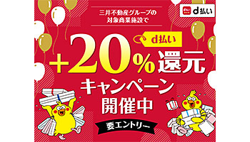 NTTドコモは、エントリーの上、スマートフォン決済サービス「d払い」のコード決済で支払うと、通常分に加え、20%還元する「三井不動産グループの対象商業施設でd払い+20%還元キャンペーン」を8月14日から実施している。期間は9月6日まで。商業施設ごとに異なる対象外店舗など、注意事項はキャンペーンサイトに掲載している。