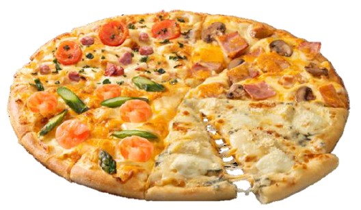 「ワールド10チーズ・クワトロ」は、(1)「オランダ王室御用達ベームスターチーズ」、(2)「フランス産ミモレットチーズ&シュリンプ」、(3)「プレミアムセブンチーズ」、(4)「英国産チェダーチーズ&ハム」の4種の味が楽しめる、クワトロピザ。