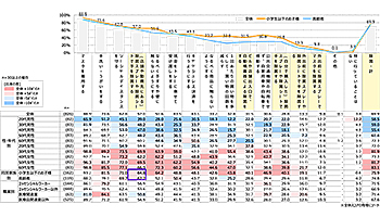 外出時に行っている除菌・ウイルス対策を尋ねた質問では、「(店頭や勤務先にある)除菌スプレーや除菌シートでの手の除菌」(57%)が最多で、同居家族別では小学生以下の子どもや高齢者のスコアが高かった。