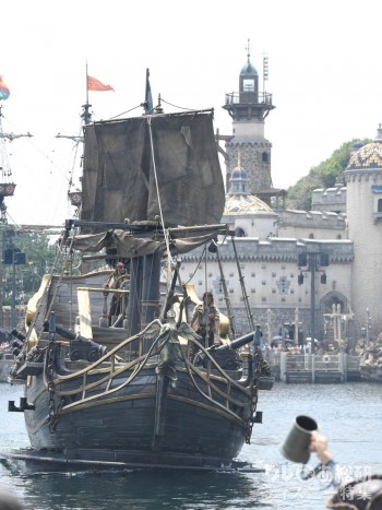 ミッキー広場などの各可動式ステージは段差形式に設置され、まるで船の上の甲板の様になっていたり、地面に置かれた大砲からも水が放出されます。