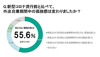 調査対象者のうち、日本人に新型コロナウイルス感染症の流行前と外出自粛期間中を比較して孤独感がどのように変化したかを尋ねたところ、55.6%が「新型コロナ流行前も自粛期間中と同じくらい孤独を感じた」と回答した。