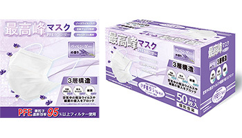 サムライワークスは、PFE95%以上の高密度フィルターを採用した、ラベンダーが香る3層構造の夏用不織布マスク「最高峰マスク<PFEラベンダー>」の予約販売を、オンラインショップで8月25日に開始した。1箱50枚入りで、税別価格は数量限定30%オフの2100円。