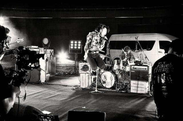 横アリの広いフロアの一角に楽器や機材や照明が並んでいる、その後ろにハイエースを駐めると、4人はクルマを下り、持ち場につき、鈴木圭介(ボーカル)の「どうもフラワーカンパニーズです! ようこそ、横浜アリーナ!」という挨拶から、1曲目「白眼充血絶叫楽団」になだれこむーーというオープニング。