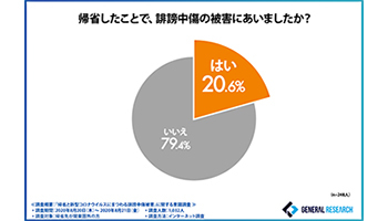 そこで、「帰省したことで、誹謗中傷の被害にあったか」と質問したところ、2割以上が「はい(20.6%)」と回答した。約5人に1人の人が、帰省時に誹謗中傷の被害にあっているようだ。
