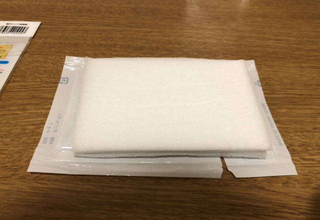 スポンジを開封していきます。薄く平らなスポンジですが、洗浄液を染み込ませると少し膨らみました。