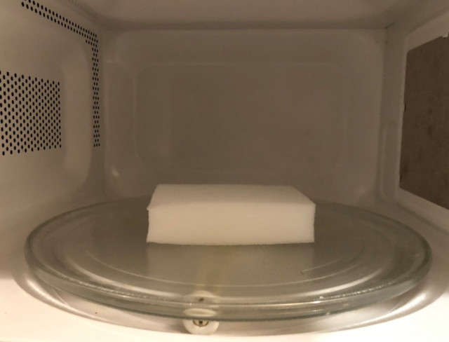 洗浄液を染み込ませたスポンジを電子レンジでチンします。