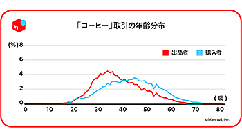 逆おさがり型の商品「コーヒー」では、出品者の平均年齢が38.8歳、購入者の平均年齢は43.7歳、出品者が30代、購入者が40代を山として分布しており、贈答品などを自宅で使いきれない下の世代から、上の世代にモノが循環していると考えられる。