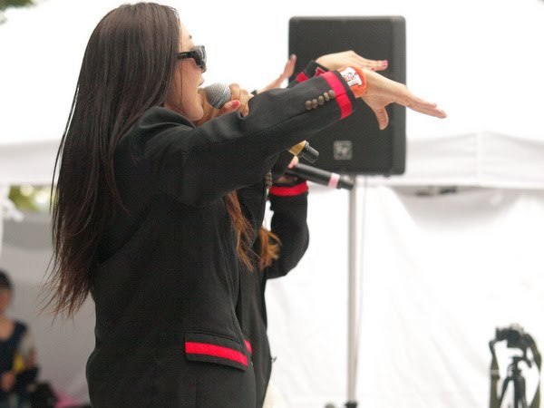 で、タイムテーブルとにらめっこしていたんですが、ここで一度、外にあるGreen Oasisステージを見に行けば、鈴木が推薦した「Love La Doll」が見れるかも…。ということで、一度プレスゾーンを離脱してGreen Oasisステージへ。そこにいたのは、「hy4_4yh」(ハイパーヨーヨ)!Negiccoちゃんとのスプリット・シングルを発売したのでご存知の方も多いかと思うんですが、こちらのグループも結構ベテランで、東京のライブハウスを中心に長く活動しております。この日鈴木が見たのがだいたい4年ぶり、まだ当時は4人組でした。