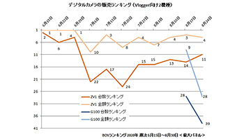 一方のパナソニックのG100は、発売直後の8月17日週では、販売台数シェアこそ28位とそこそこの売れ行きだったものの、販売金額では9位とトップ10入り。レンズ交換型であるためZV-1と異なるカテゴリだが、Vlogger向けという点では真正面からの競合製品。平均単価(同)も9万5300円と同レベルだ。